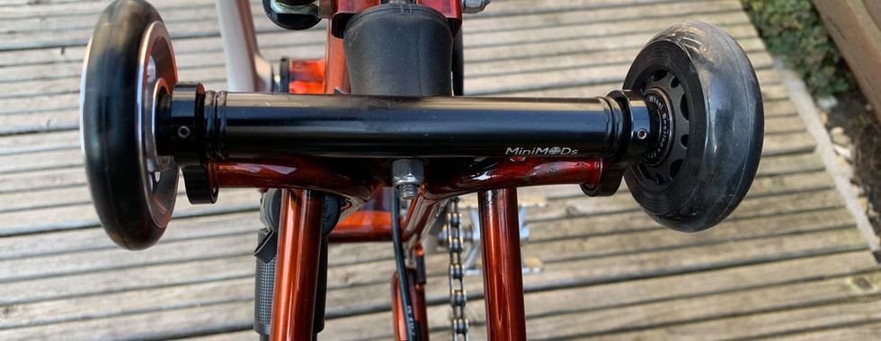 I started with swapping the standard supplied roller wheels for Bromptons own larger easy wheels, which was an improvement but the thin profile and larger diameter made the bike actually a bit less stable.